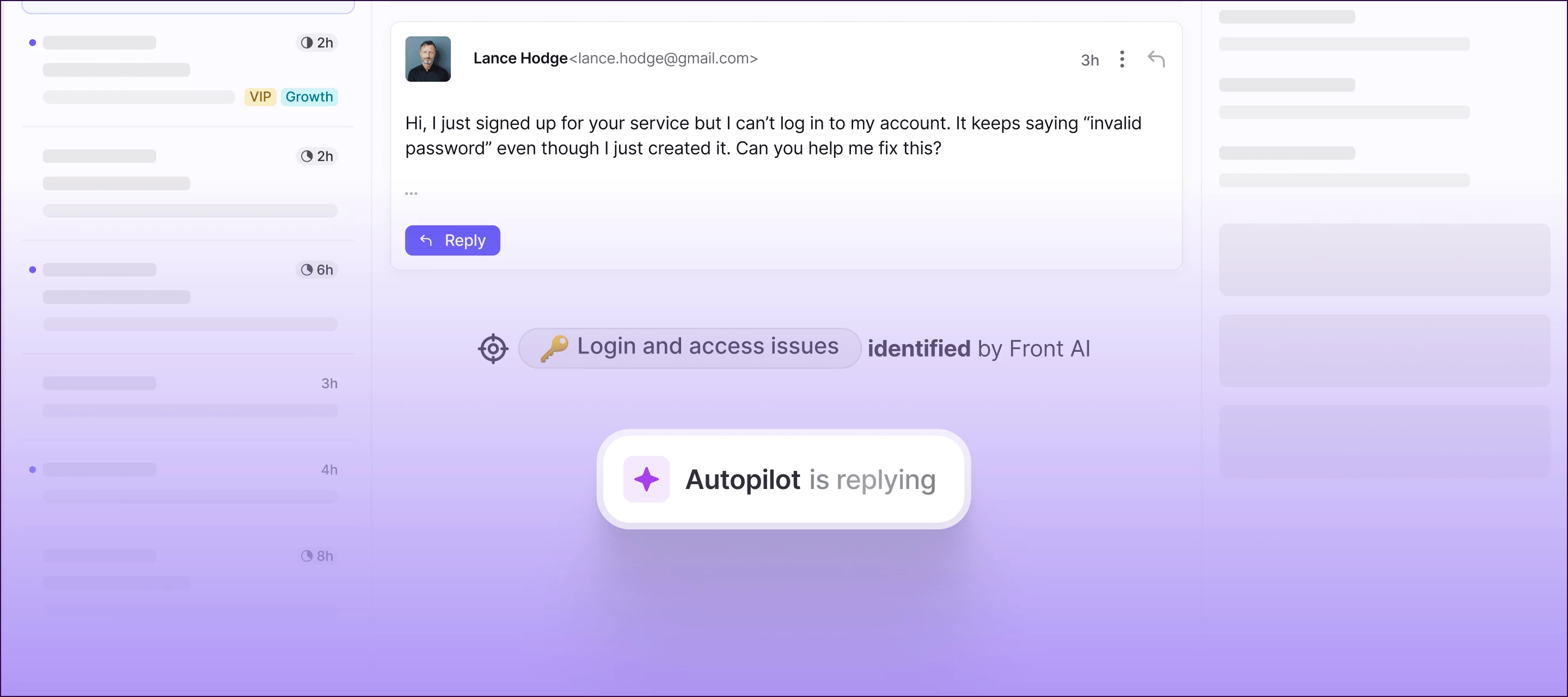 Autopilot: Autopilot is Front’s new omnichannel AI agent that gives admins control over automation. Autopilot lets you decide exactly which Topics should be handled by AI and which should go to humans. Resolve routine questions in seconds with AI-powered auto-replies informed by your help content and conversation history.