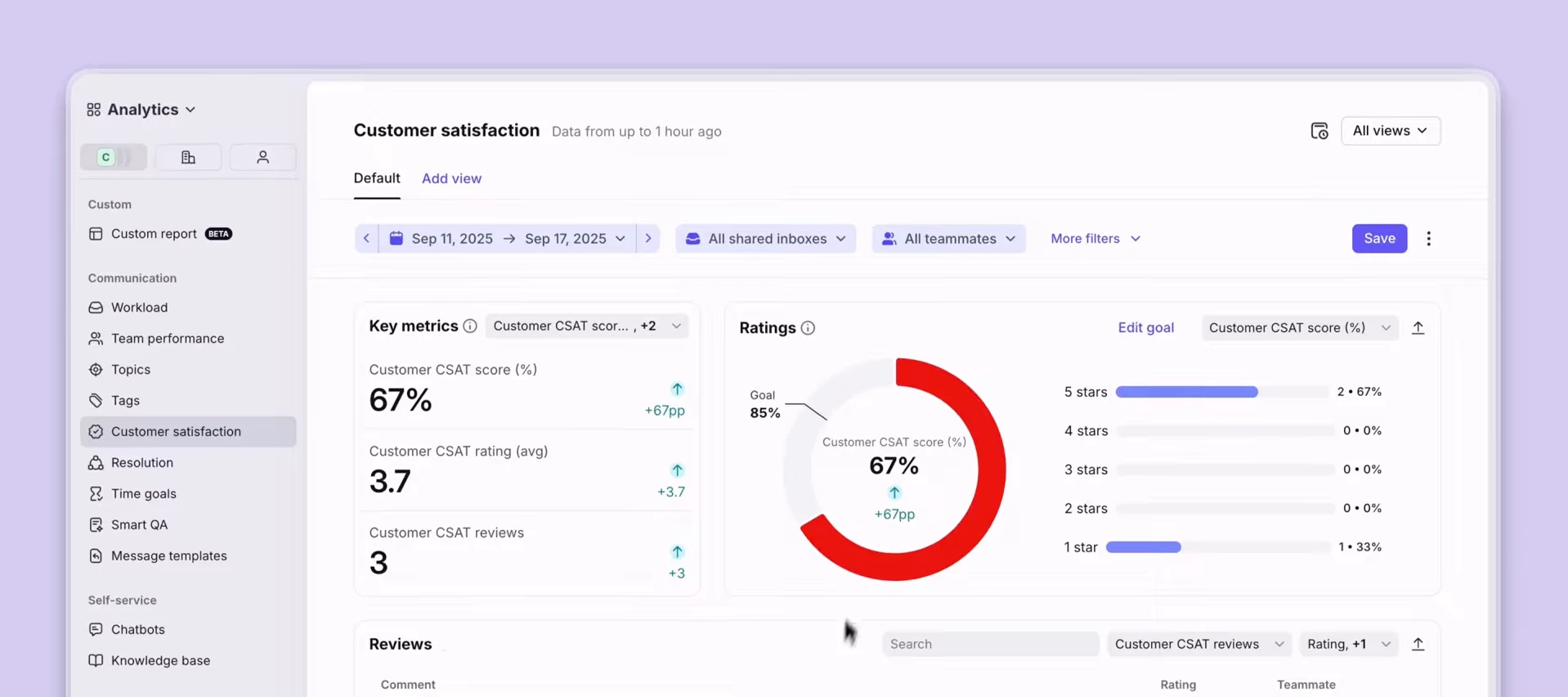 This is an AI-powered feature in Front that infers customer satisfaction for every meaningful conversation, without relying on your customers filling out surveys. Instead, Smart CSAT automatically analyzes sentiment and effort to give you a more accurate, reliable view of the customer experience.