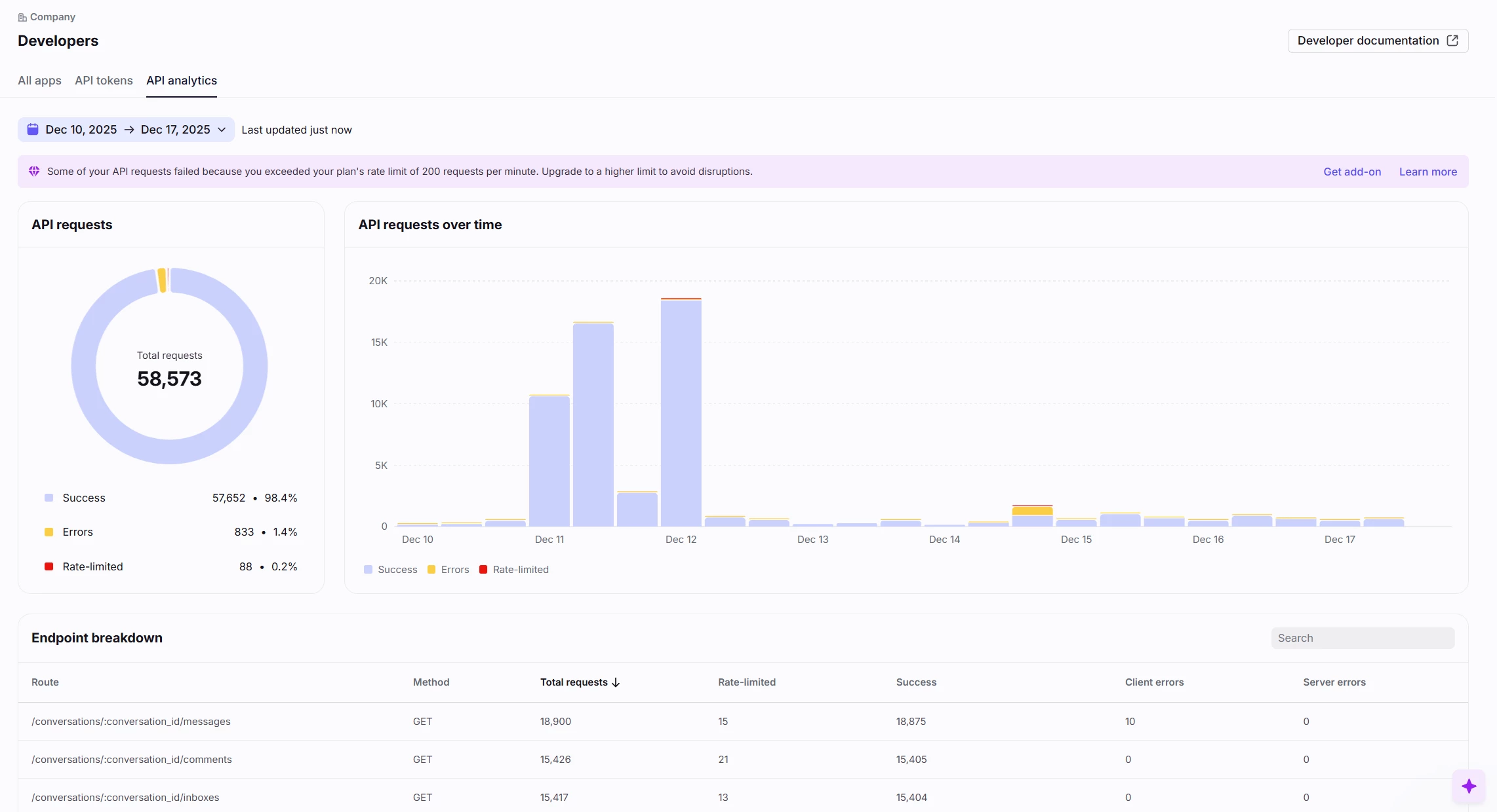 You can view data for the last 30 days and drill down into specific time periods. Company admins can access it by navigating to Settings > Developers > API analytics.