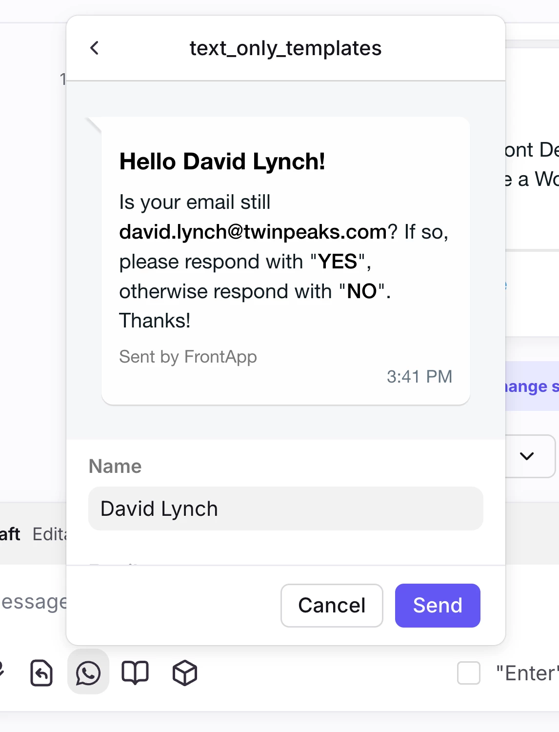 The templates are configured in the external service (such as WhatsApp, Facebook, or Google) and synchronized to Front using the Channel API. These templates can include variables that are dynamically replaced with Front-specific values when sent, offering a high degree of customization.