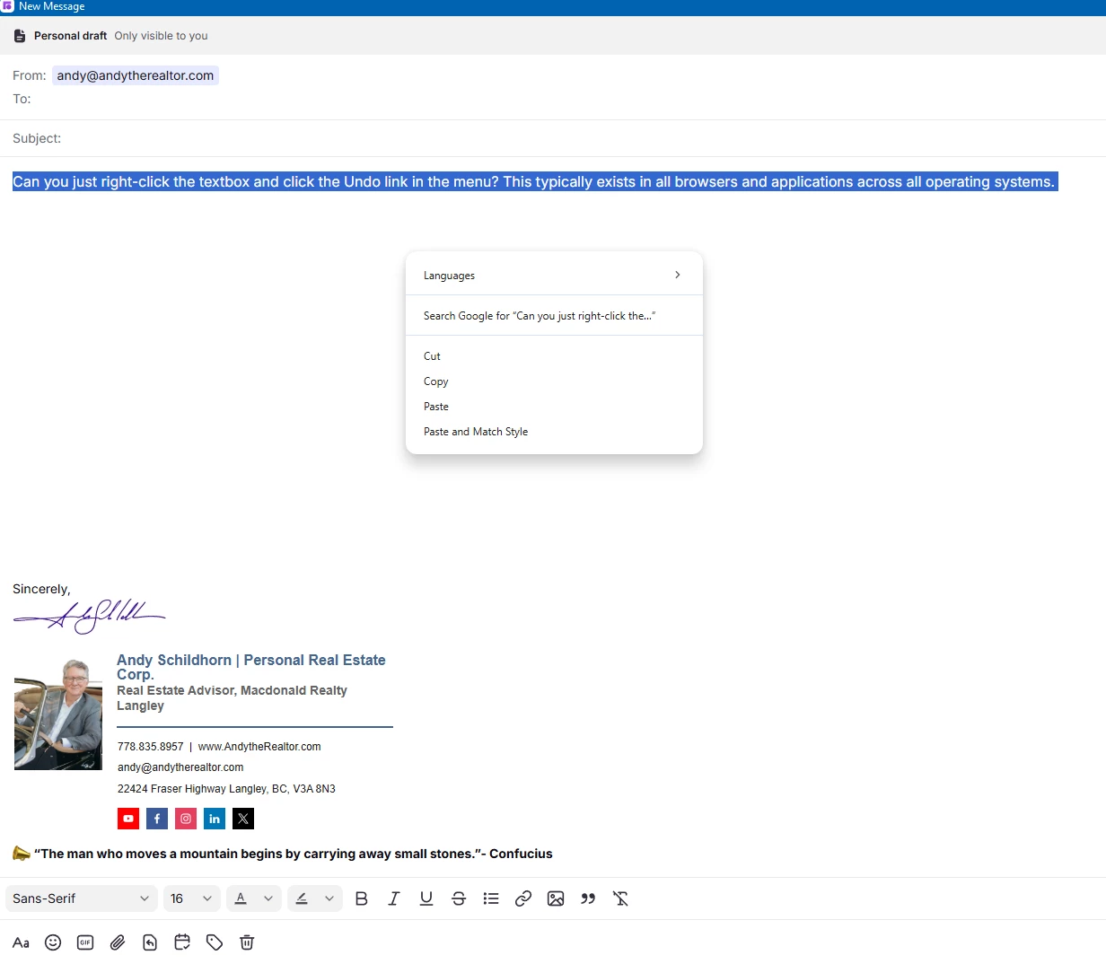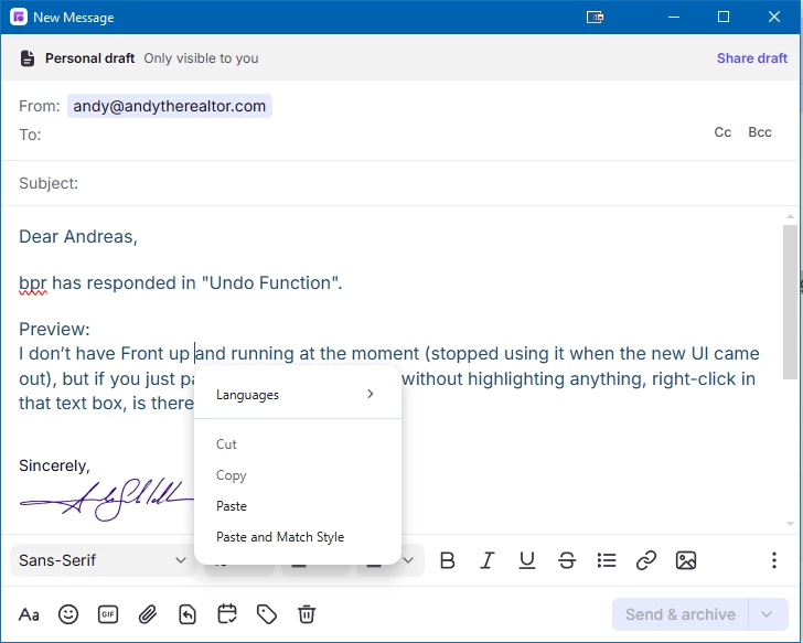 It would be great to have “undo functionality” - It’s pretty cumbersome when you paste something into a conversation and then need to remove it...would be great if there was just an undo “button” to click on