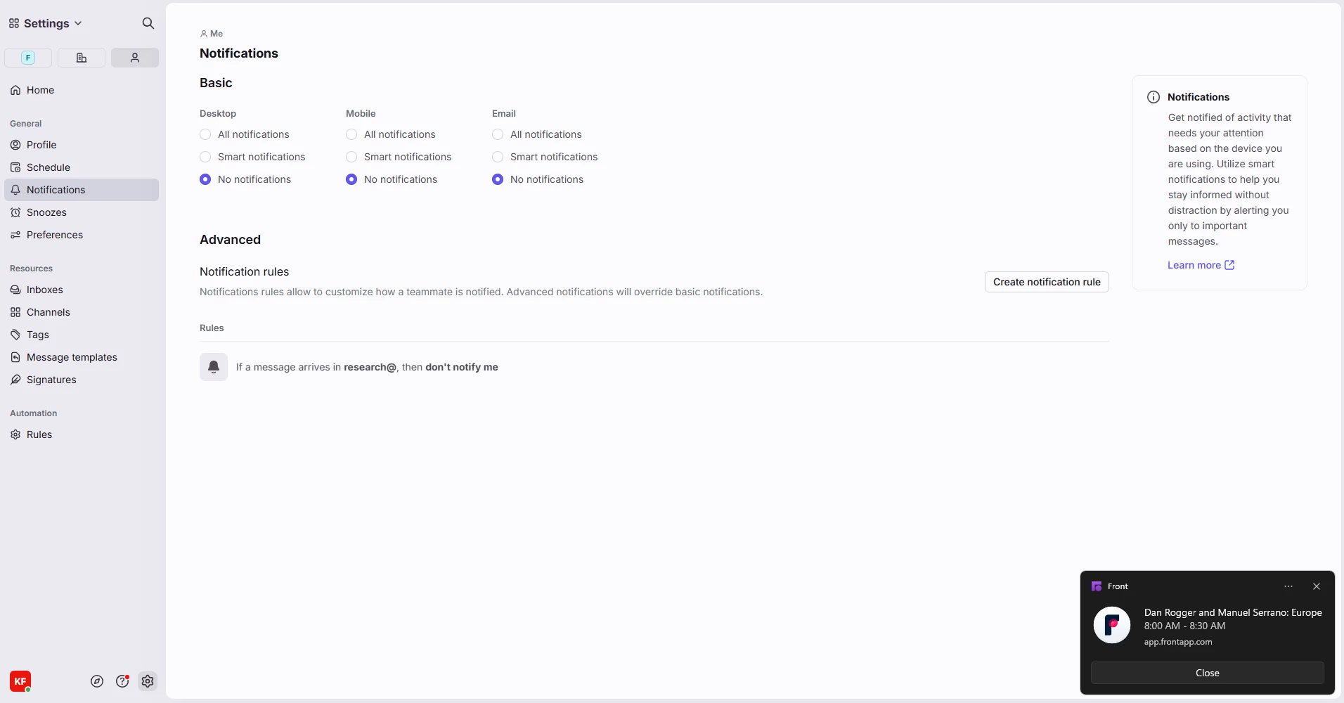Using the Front webapp (as a PWA) on Windows, how can I disable notifications about calendar events? We use Google Calendar, so I rely on Google Calendar for notifications and Front creates duplicate notifications. On Settings > Notifications, I've set Desktop and Mobile to "No notifications”, but I am still receiving Desktop and Mobile calendar notifications. See screenshot below.