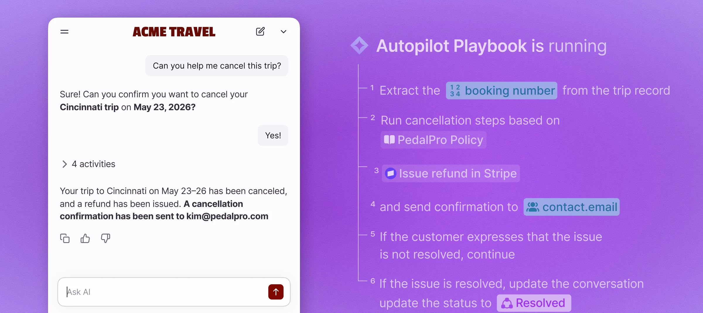 Let customers complete requests from start to finish, without waiting for an agent. Embedded directly in your app or website, Resolve runs Autopilot Playbooks to handle everything from quick questions to complex multi-step workflows. For requests that need a human, Resolve creates a ticket with full context already captured so your team can step in immediately without starting from scratch.