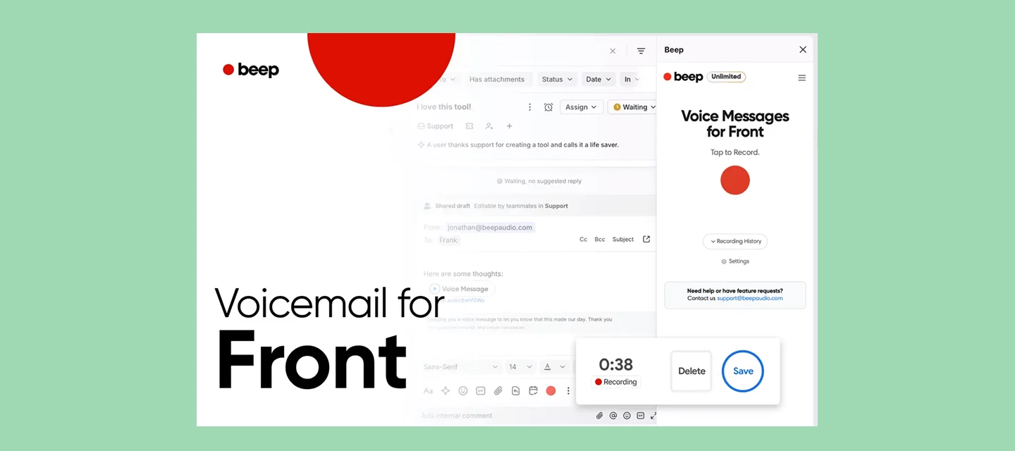 - Beep: Beep brings voice messaging into Front’s composer and sidebar, so you can record and send audio messages (with transcripts) in conversations and internal comments. It’s a faster, more personal way to explain complex issues or collaborate with your team.